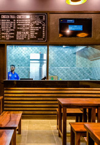 Khan Chacha, a popular roll fast food restaurant, was designed to create a fuss free interior design with three basic elements. Brick wall painted white, sheesham wood and wall pin up boards with branding of the restaurant. The benches are made in solid sheesham wood with a natural polish.