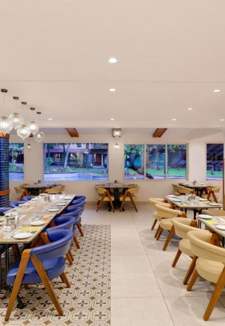 The Guest room design envisaged a beachy colour palette with Light Oak wooden shades and white washed wooden laminates which evoke a beach shore. A feeling of luxe with wooden battens in the high ceiling room with brass chandeliers and a comfortable modern room setting. The Guest Bathroom explored a classic colour palette of blue and white patterned tiles with beige tiles, large mirrors and adequate lighting. The citrus all day dining was brought to life with modern furniture and a play of terrazzo tiles with beige decorative patterns. Bringing goa flavors with a modern twist.
